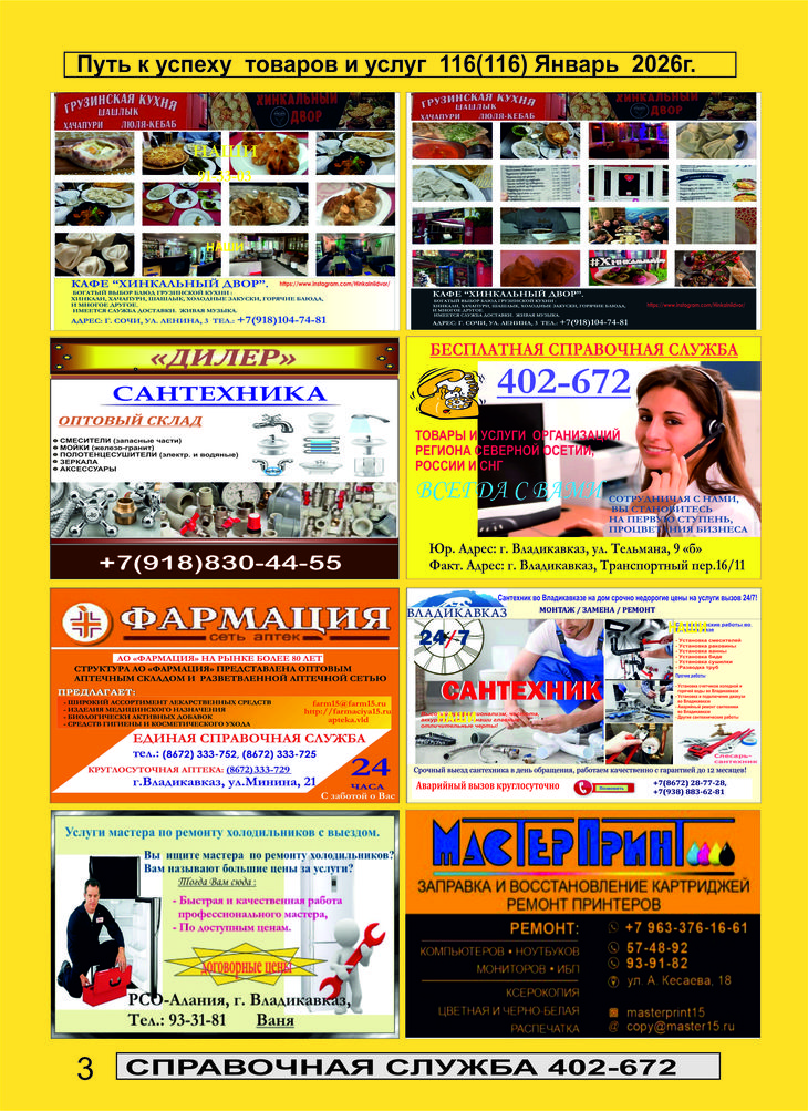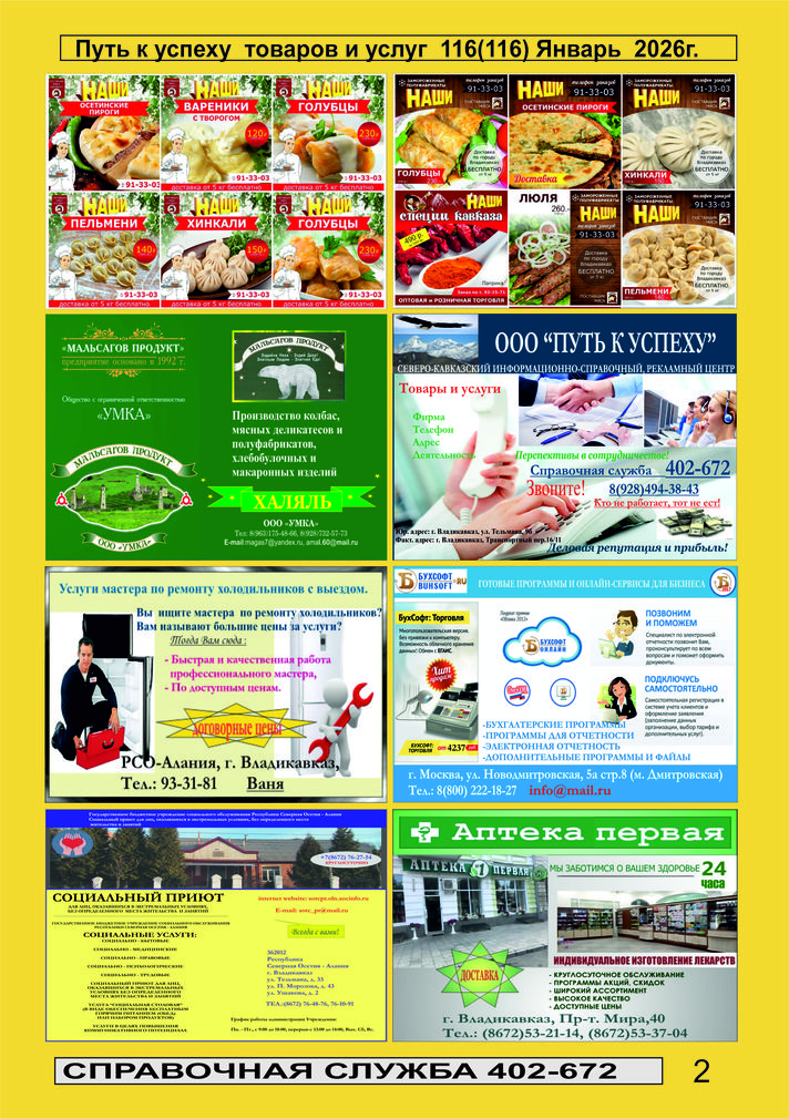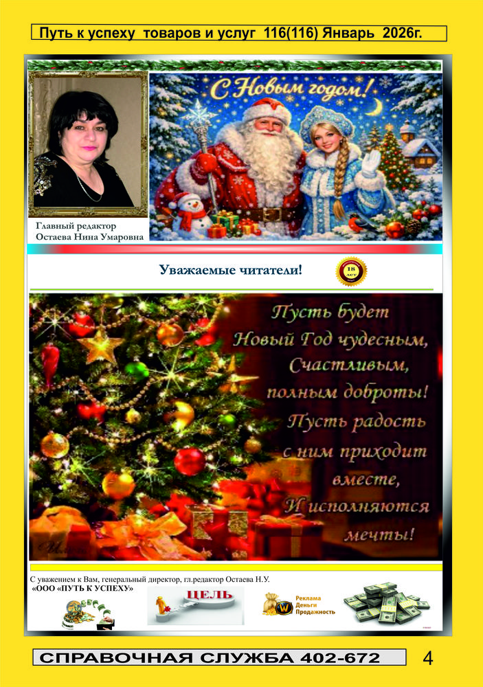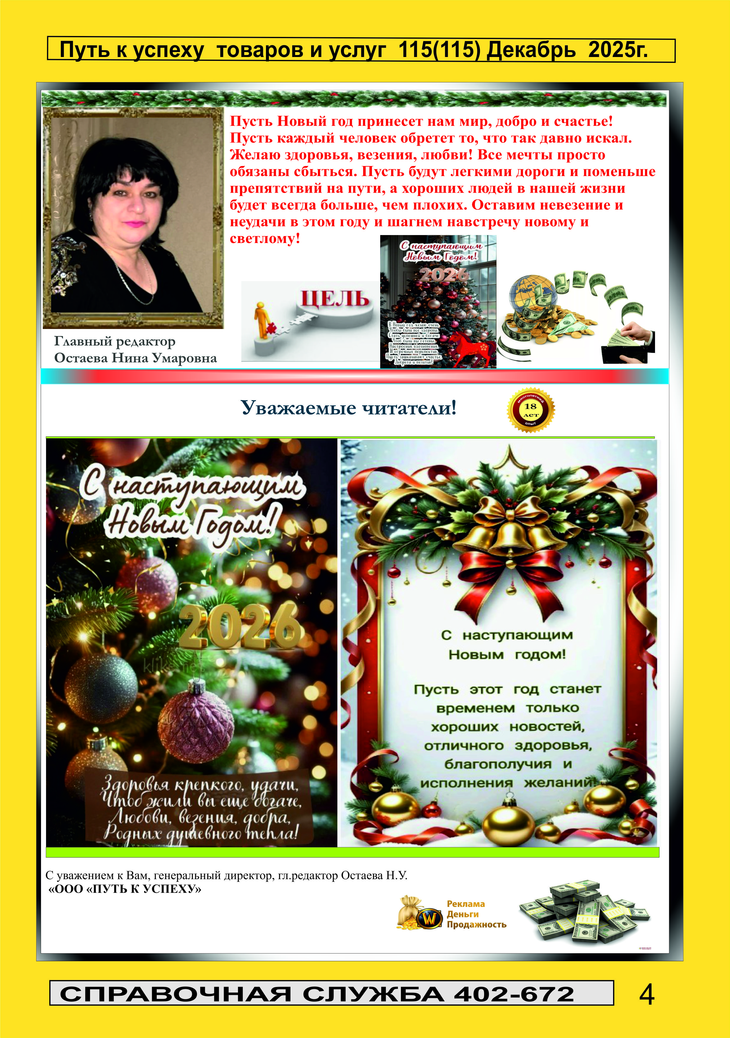 Своими услугами , мы намерены принести пользу , являясь катализатором намеченных целей предприятий, , открывая дорогу своей рекламой, оповещая о товарах и услугах организаций, мы сообща вместе с Вами будем развивать Ваш бизнес. Удачи Вам и новых перспектив в Новом 2026году!
